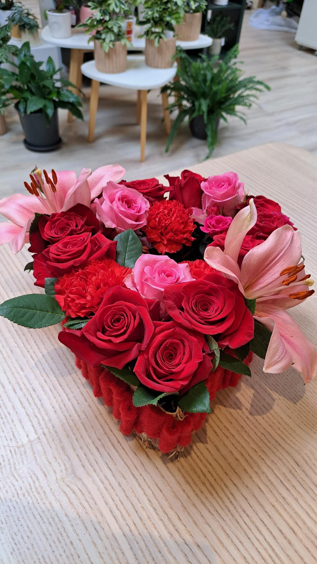 alle materiaal (bloemen, oasis, vaas, schaar, snoeischaar, lijmpistool,…), versnapering en drankje (koffie, thee, frisdrank, glaasje bubbels), begeleiding stap voor stap + voorbeeldexemplaar.